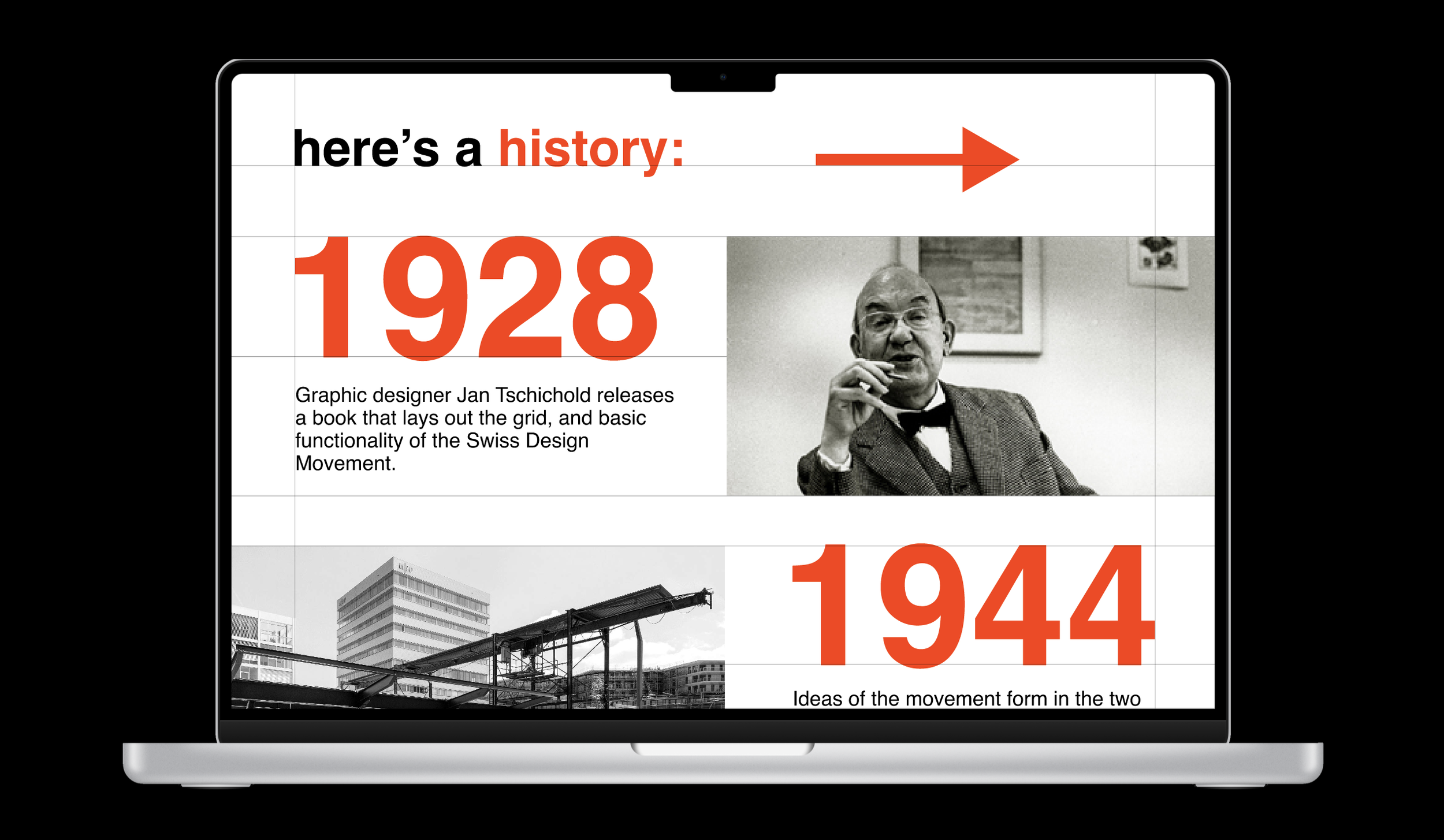 After establishing our mission statement and completing our research, we created a system that accurately represented Swiss design. Although we divided tasks, we worked on each phase of the process as a group and continuously gave each other feedback and encouragement.
