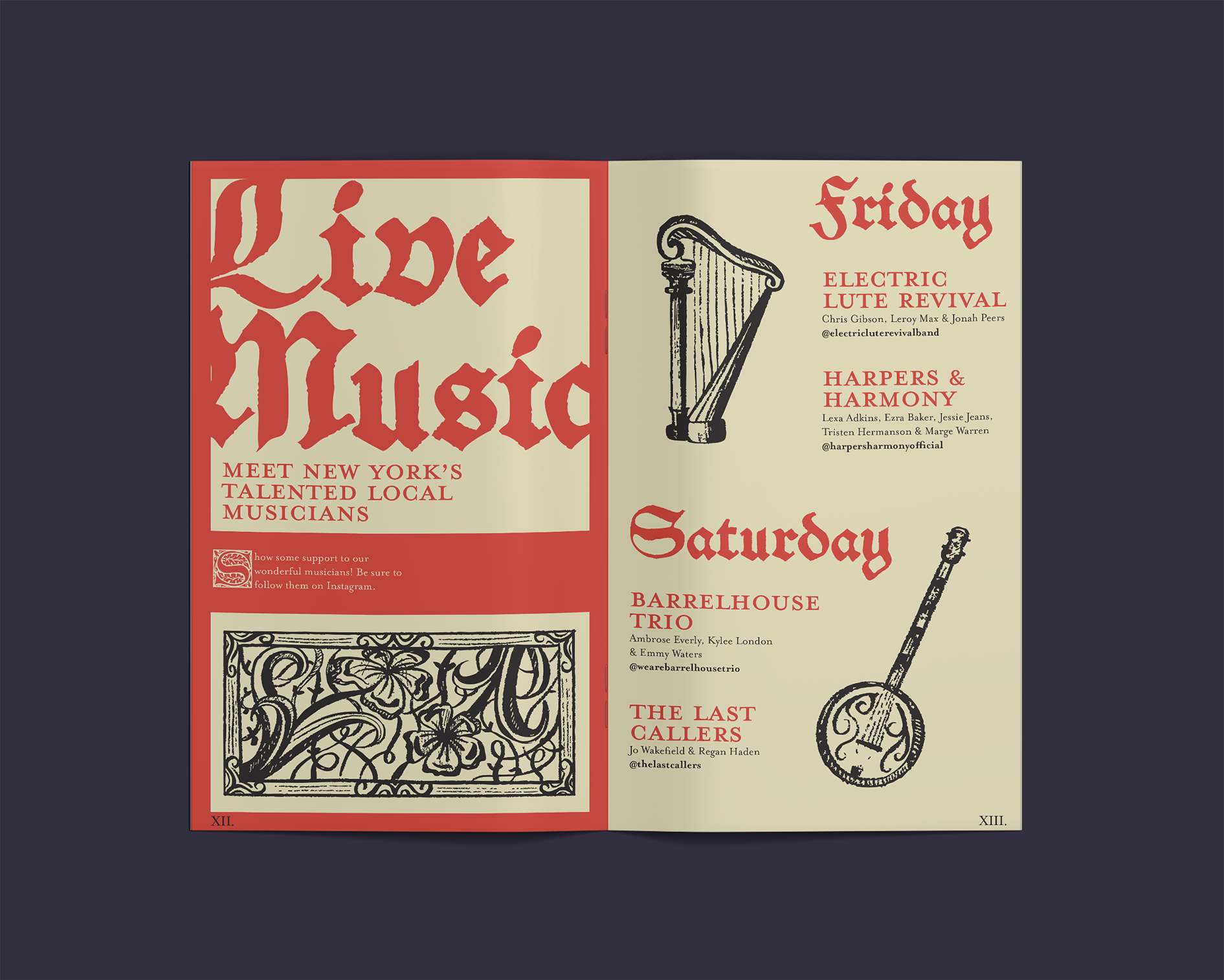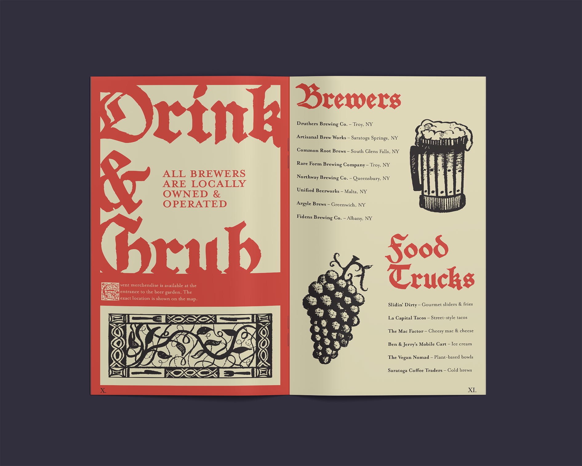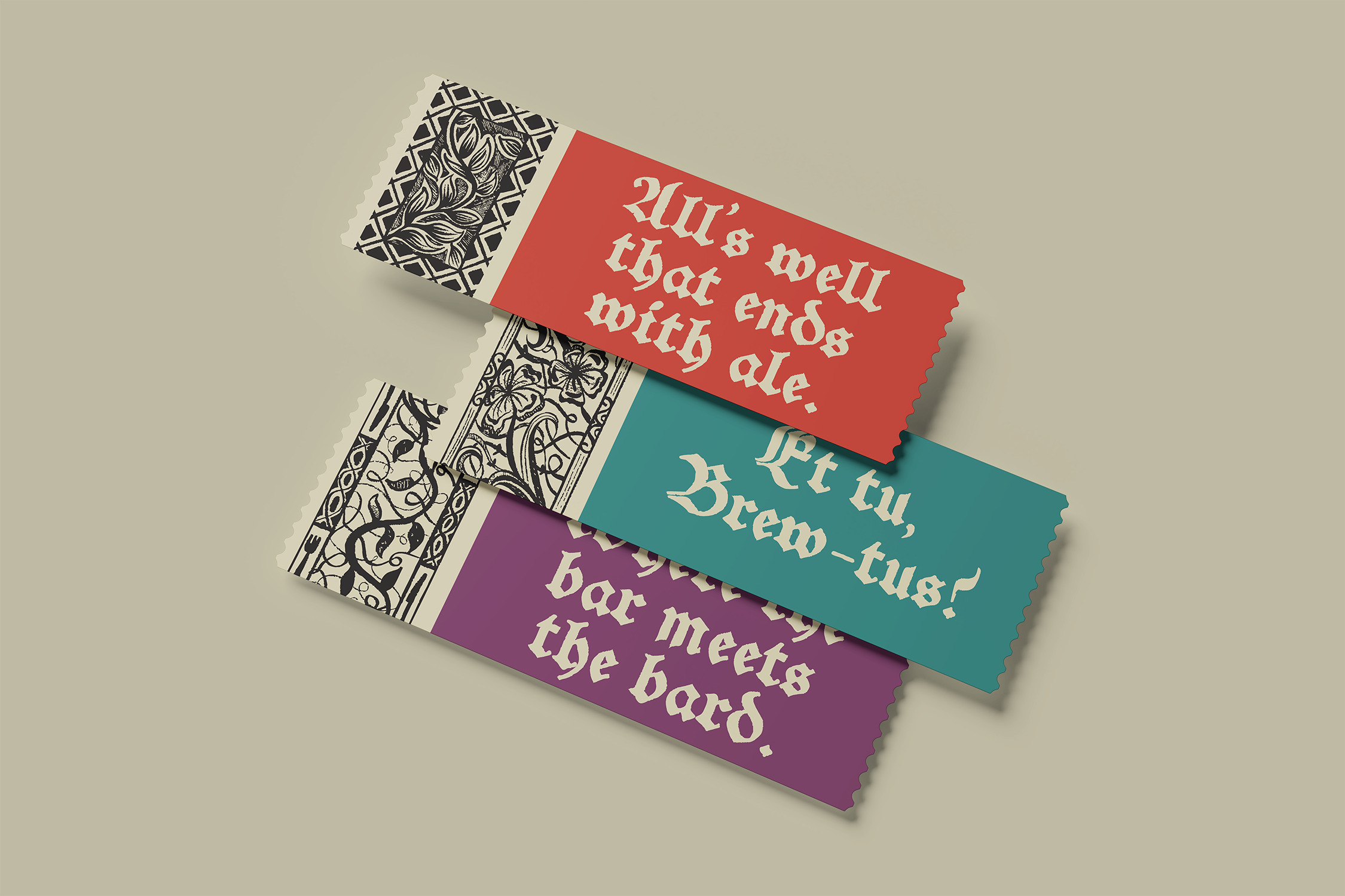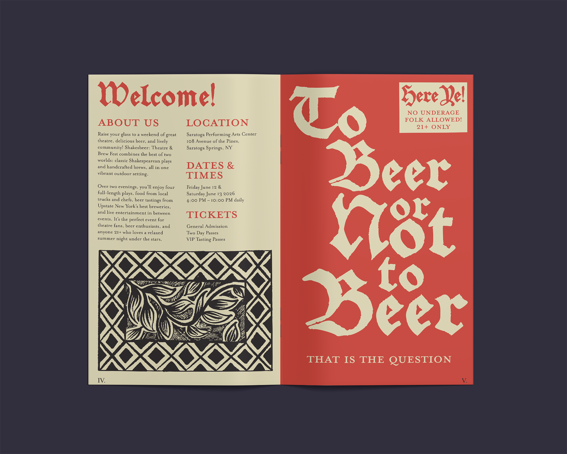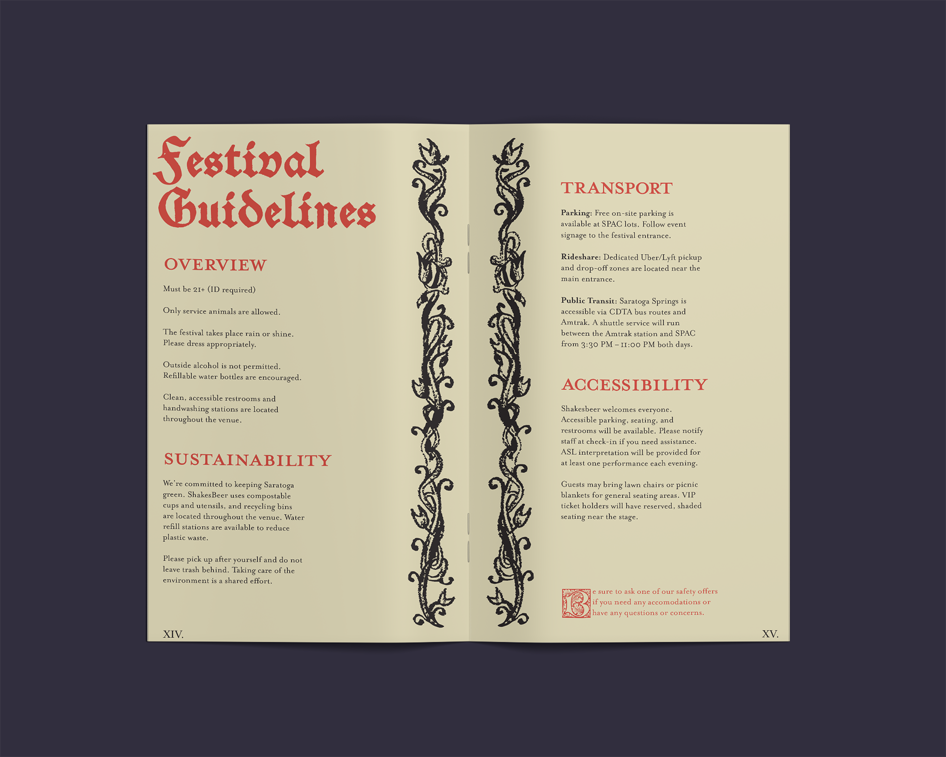 To capture the essence of Shakesbeer Fest, I created a mood board with some illustative and typographic inspiration. After doing some research, I explored various typefaces, created a wordmark, and established a clear typographic hierarchy. To incorporate the festival’s old-timey yet fun feel, I drew a series of brewery and Shakespearean-inspired illustrations. I included these illustrations in all of the deliverables so there was a fun artistic element in the system.